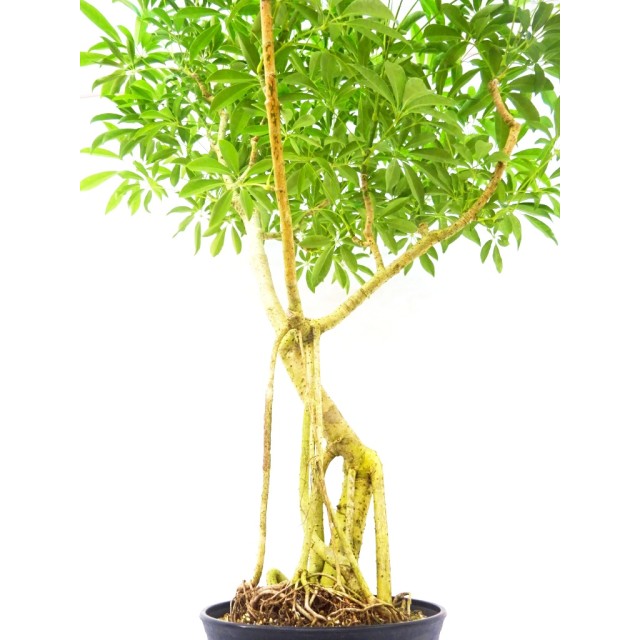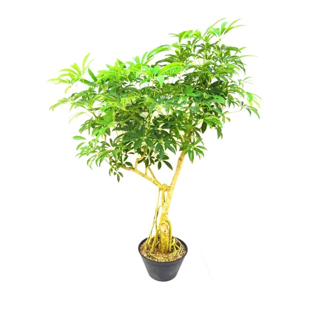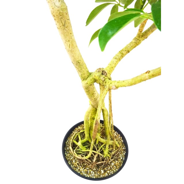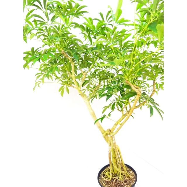 何故か?園芸流通乏しく、丸葉のホンコンカポック(Schefflera arboricola ''Hong Kong'')の支柱立てての仕立ての鉢の流通が主流だった頃なので、葉柄の長いこのシェフレラは、ただの原種の二流品扱いで、稀に原木を鉢に数本おっ立てて葉をふかしたものが、八丈島から出荷が有った程度の植物でした。